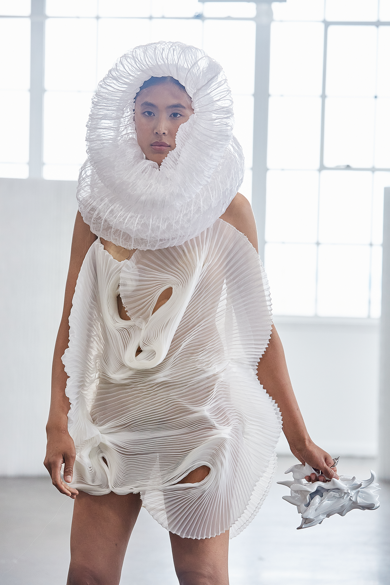 The EXTERNAL NERVOUS SYSTEM collection is a compilation of numerous miniature neuro devices, constructing a wearable component of the nervous system outside of the body. The proliferating external nerve tendrils create a connection that resonates and protects. The design of the entire series integrates elements of armour, exuding a sense of aggression and eccentric gadgetry.