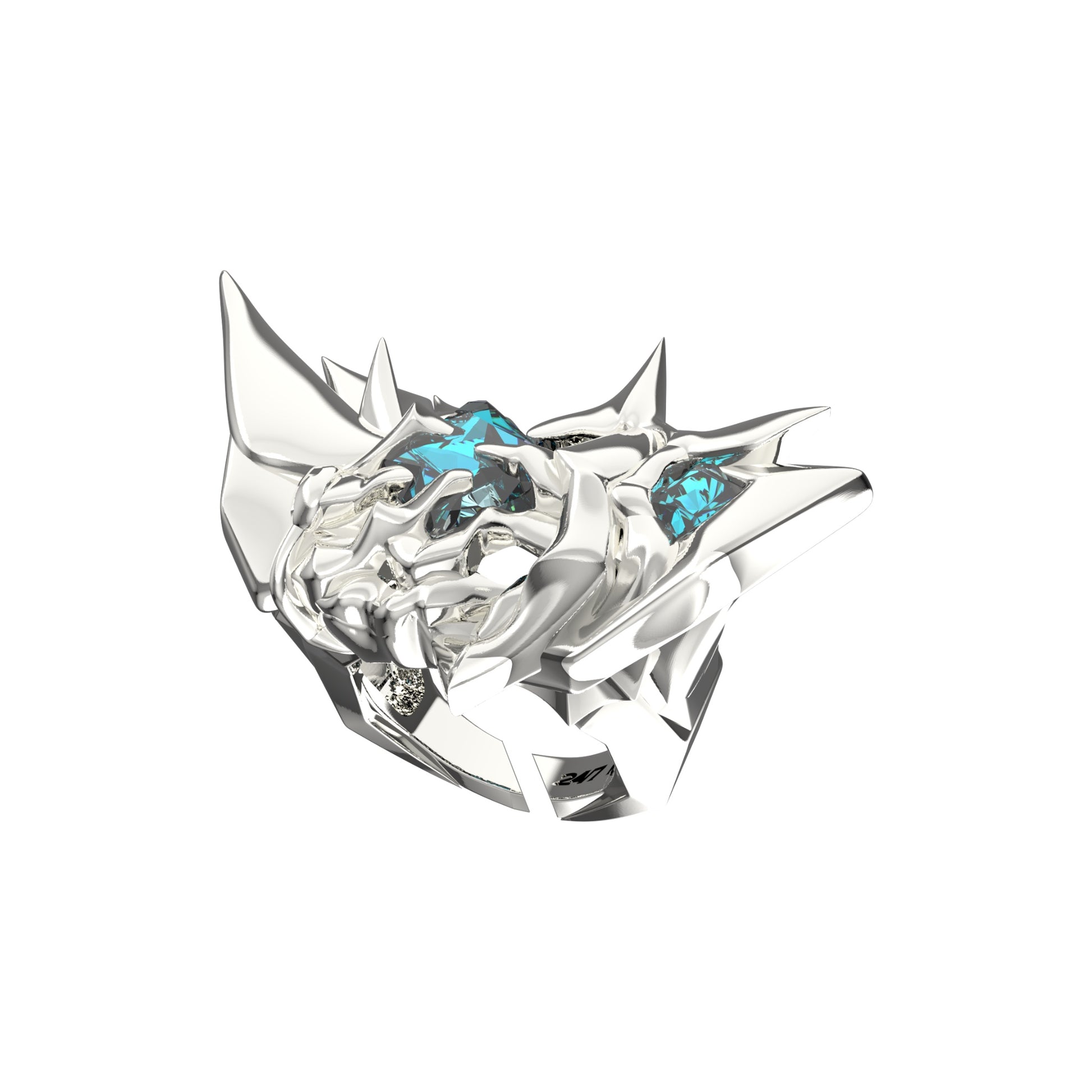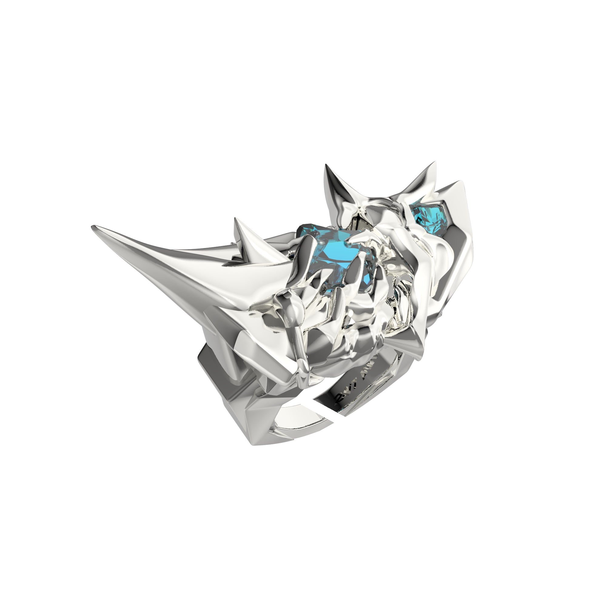 -The METALLIC COLLISION RING is the most aggressive and visually striking hand-wearable empowering device in this collection. The heavy, sharply-defined ring shape snugly fits the finger, while the light blue gemstone showcases the external nerve energy storage and transmission pathways in the finger, converting virtual energy into tangible tactile feedback for every cell. This open-end ring comfortably wraps fingers with an adjustable size within a small range, it is easy to fit most finger sizes. Logo engraved at inner band.