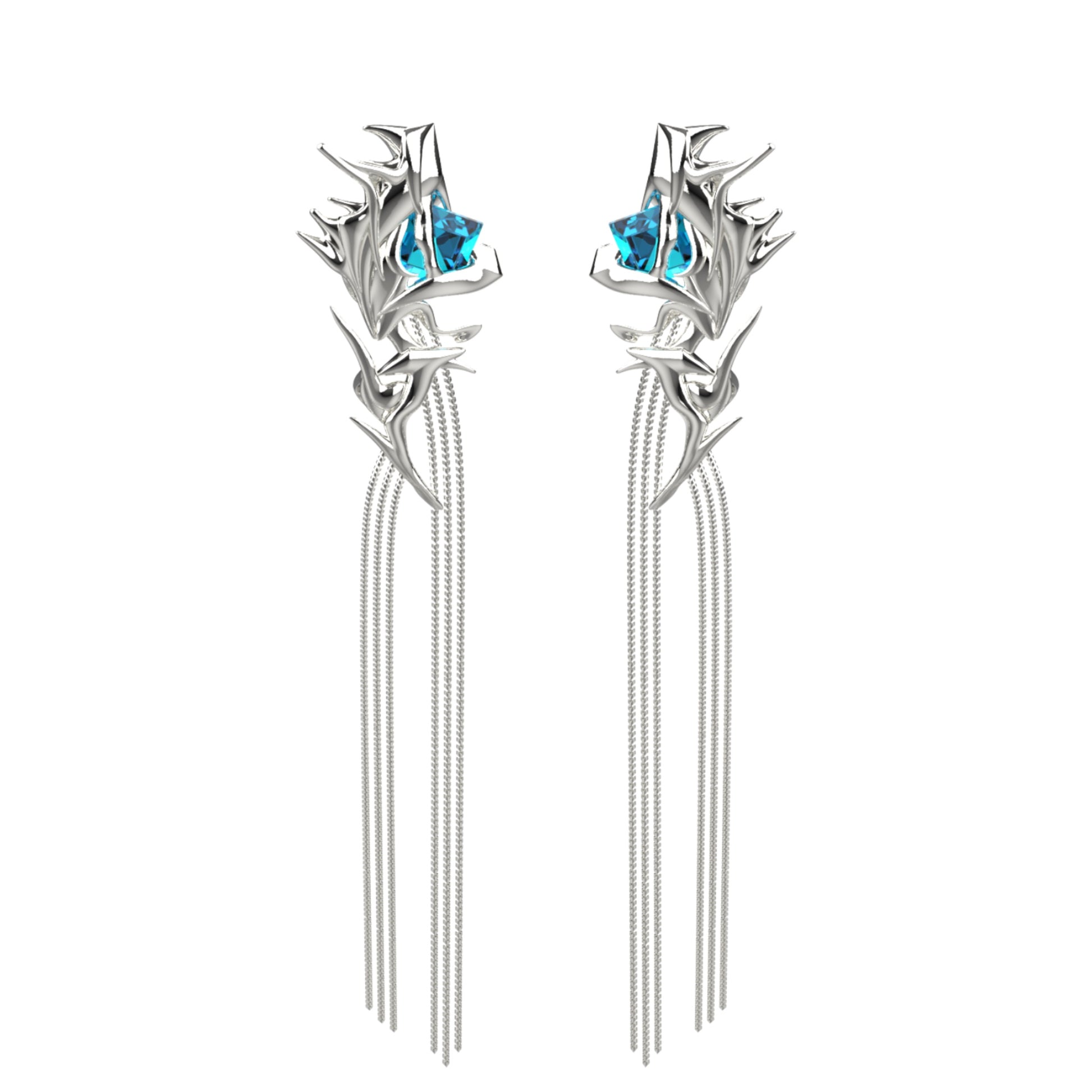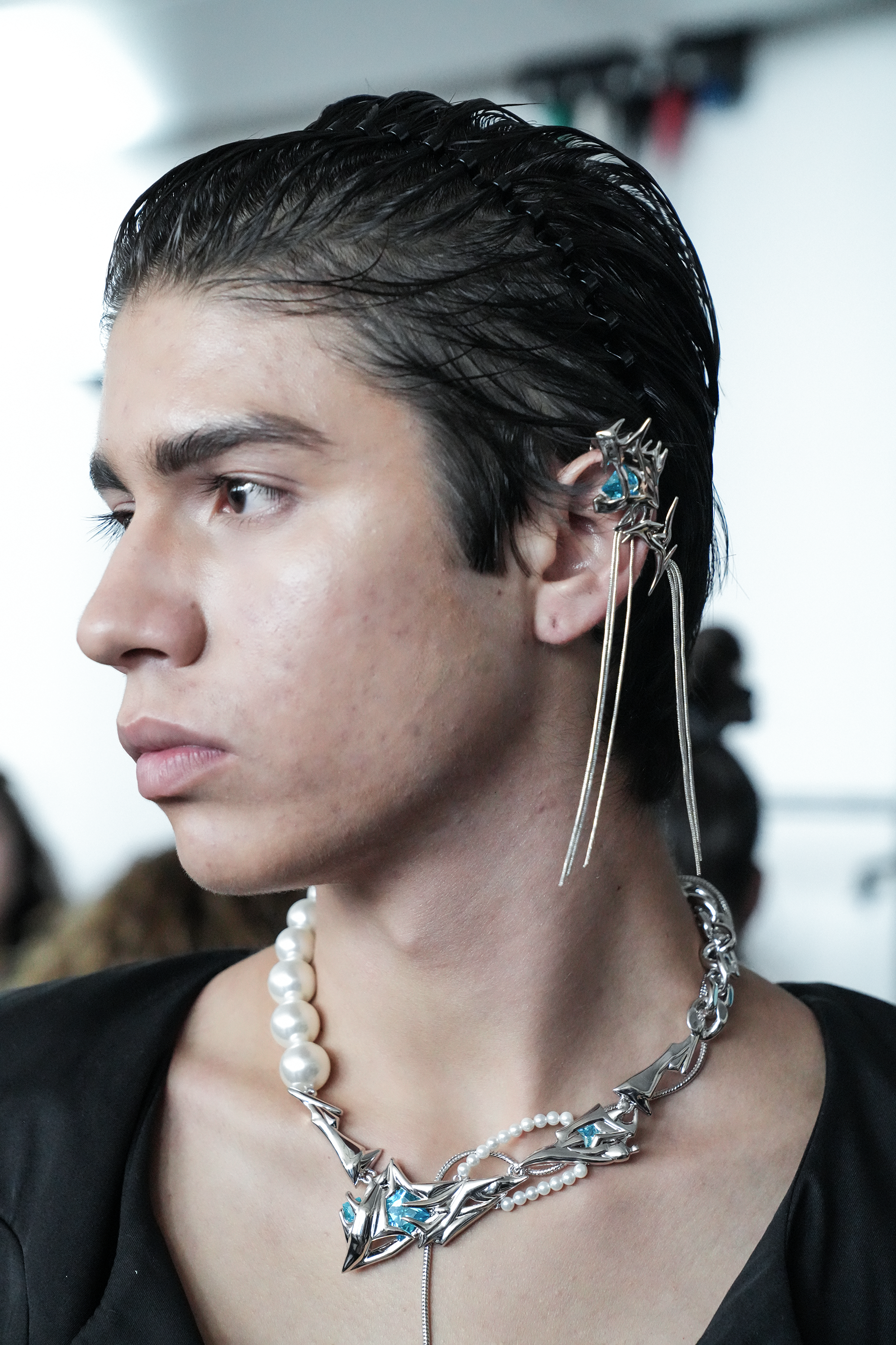 -The EXTERNAL CONNECTION Ear Cuffs, as the only external ear-wearable neural device in the whole collection, features sharp metal that follows the shape of the ear, forming external nerves that spread on both sides of the neck, a dynamic virtual energy feedback device. Each one comes with three segmented ear clip structures, securely clamping the ear and ensuring that the round snake chain maintains visiable flexibility.